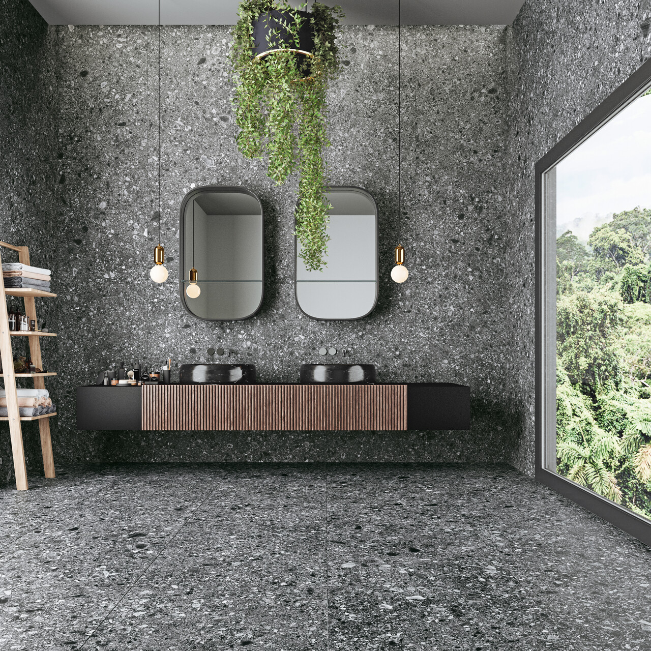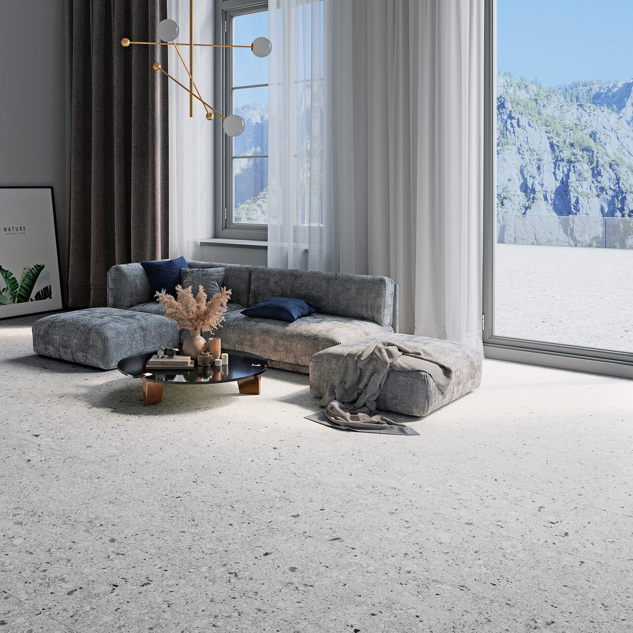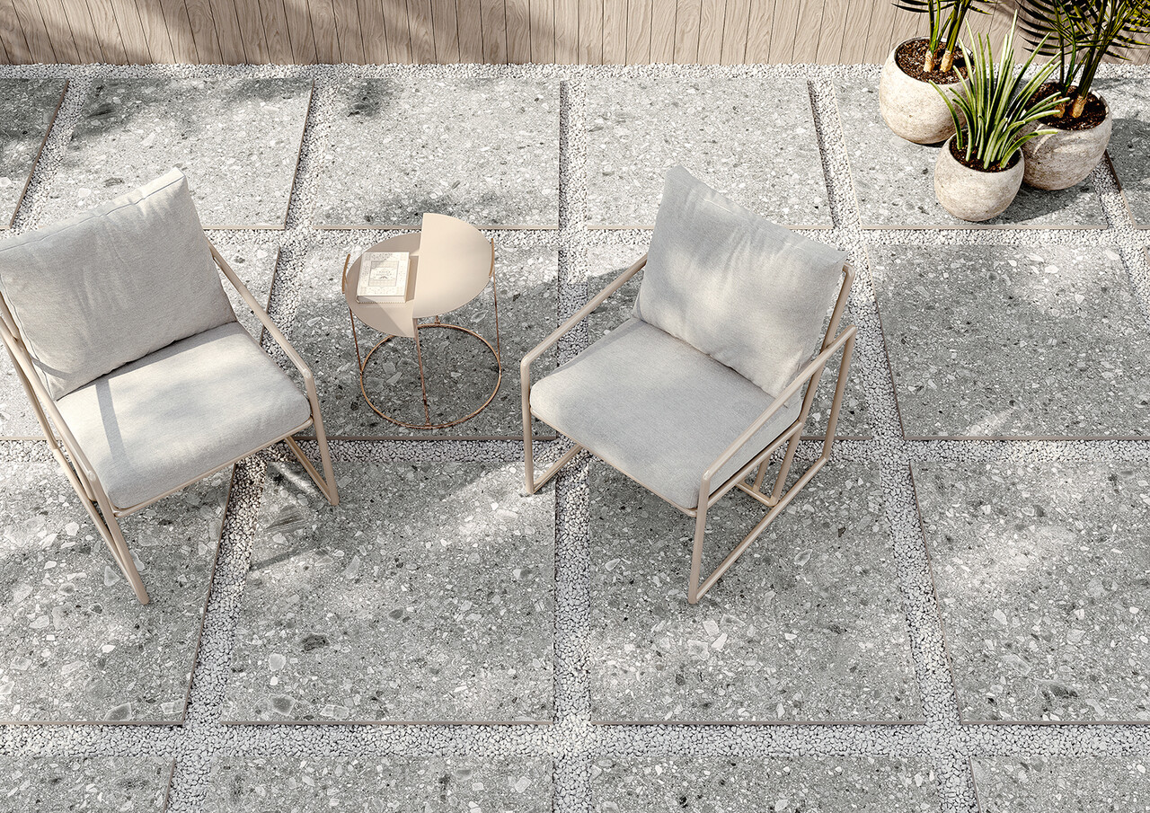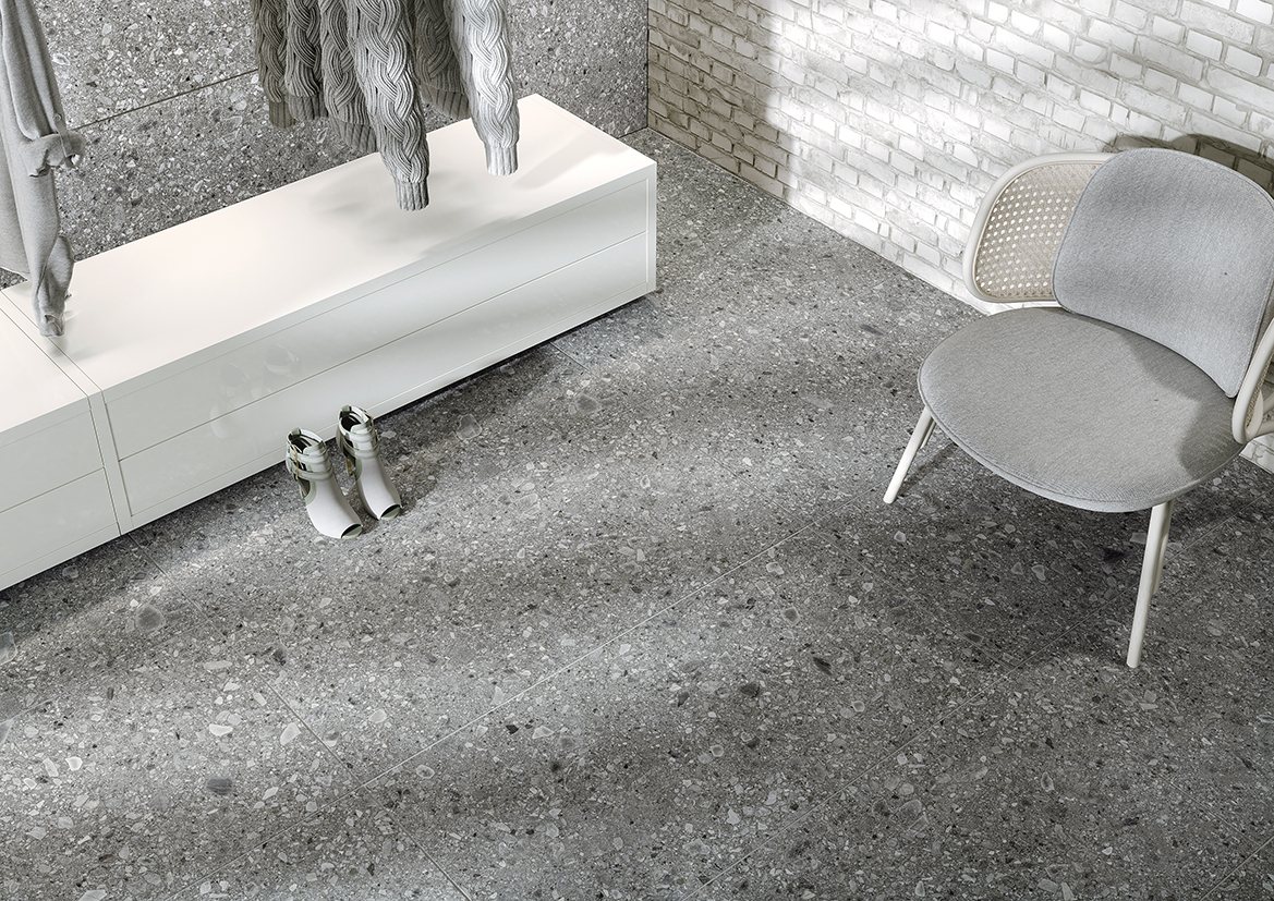 Ce carrelage s’inspire du Ceppo di Grè italien, avec ses fragments rocheux qui créent un effet minéral riche et vivant. Il apporte aux sols et murs une texture singulière et pleine de caractère, idéale pour valoriser les espaces avec un style naturel et authentique.